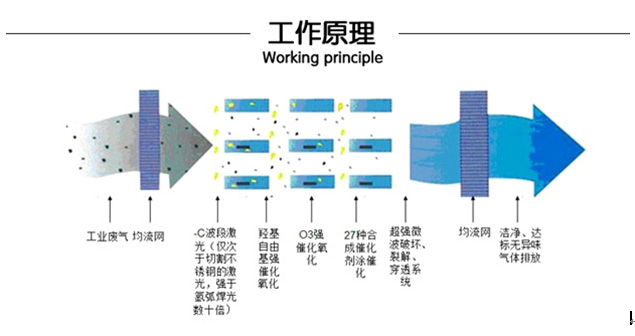 一、本產(chǎn)品利用特制的高能高臭氧UV紫外線光束照射惡臭氣體,改變惡臭氣體如:氨、三甲胺、硫化氫、甲硫氫、甲硫醇、甲硫醚、二甲二硫、二硫化碳和苯乙烯,硫化物H2S、VOC類,苯、甲苯、二甲苯的分子鏈結(jié)構(gòu),使有機或無機高分子惡臭化合物分子鏈,在高能紫外線光束照射下,降解轉(zhuǎn)變成低分子化合物,如CO2、H2O等。